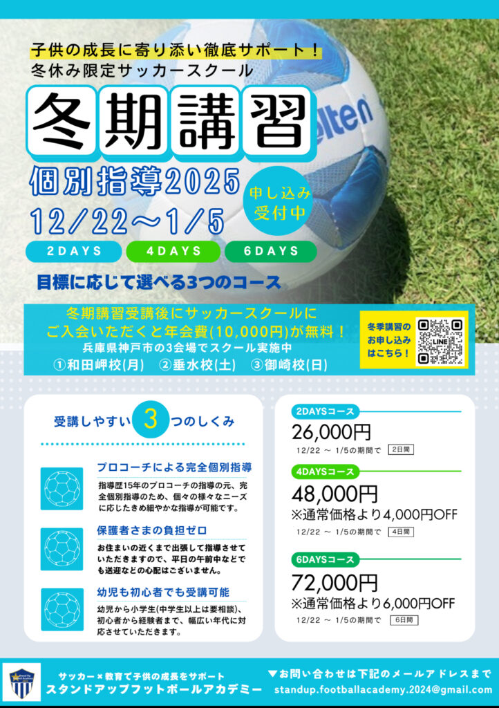 ▼冬休みの期間を利用して完全個別指導の元、様々なニーズやご要望に応じて指導をさせていただきます。(サッカーだけでなく、走るのが早くなりたいなどもOK)